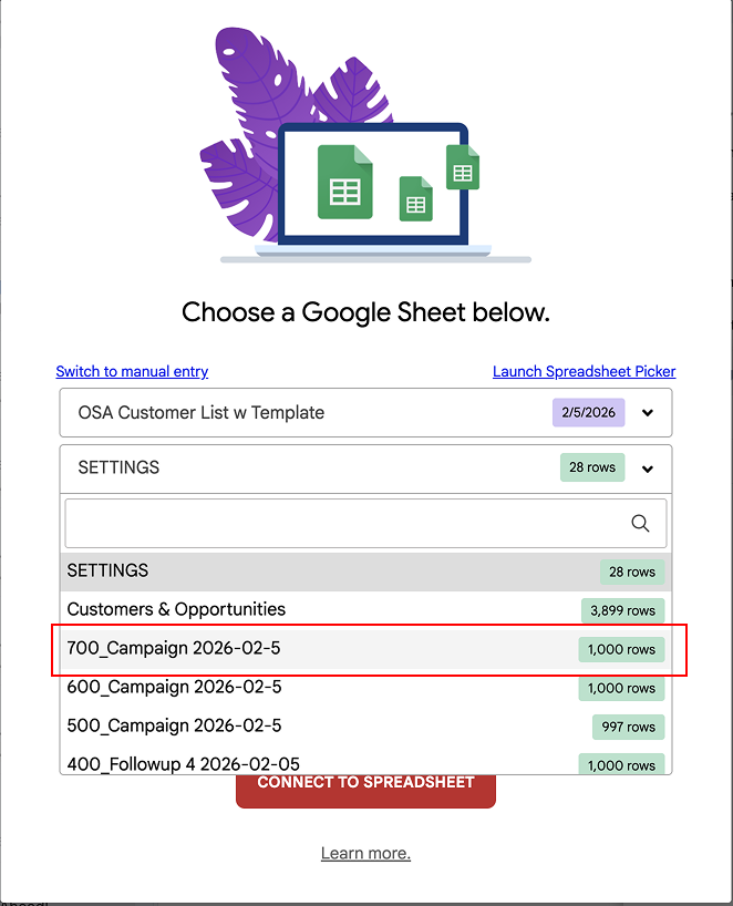 - Click the red “Connect to Spreadsheet” button.