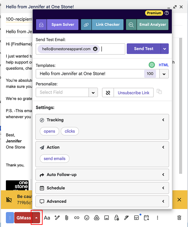 - Click the small arrow next to the red GMass button to open the settings menu.
